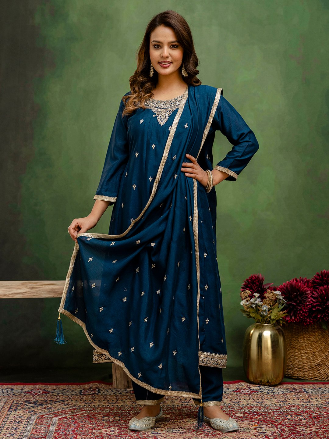 Elevate your ethnic wardrobe with this elegant teal blue silk blend kurta set, featuring delicate golden embroidery motifs all over. The kurta comes with a beautifully embroidered neckline, straight-fit pants, and a matching dupatta finished with a subtle golden border and tassels. Crafted from a comfortable silk blend fabric, this outfit is perfect for festive occasions, family functions, and traditional gatherings.
