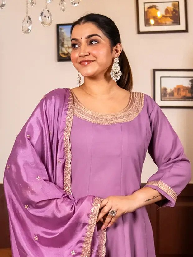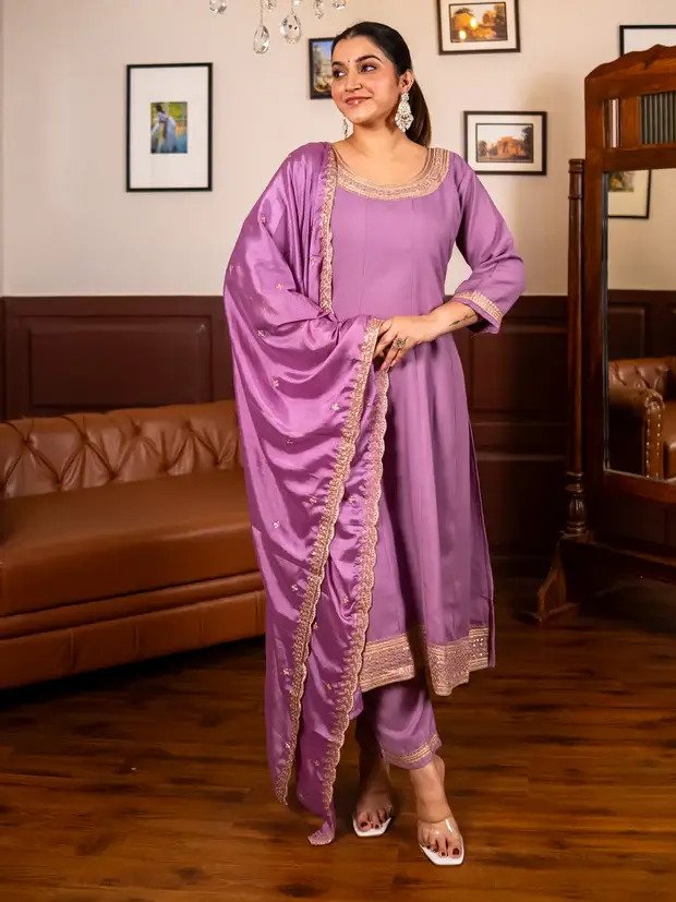 Grace your festive moments with this Lavender Floral Embroidered Kurta Set, featuring a delicately designed kurta, matching trousers, and a coordinated dupatta. Enhanced with subtle embroidery and golden lace detailing, this set brings together elegance and comfort for any celebration or special occasion.