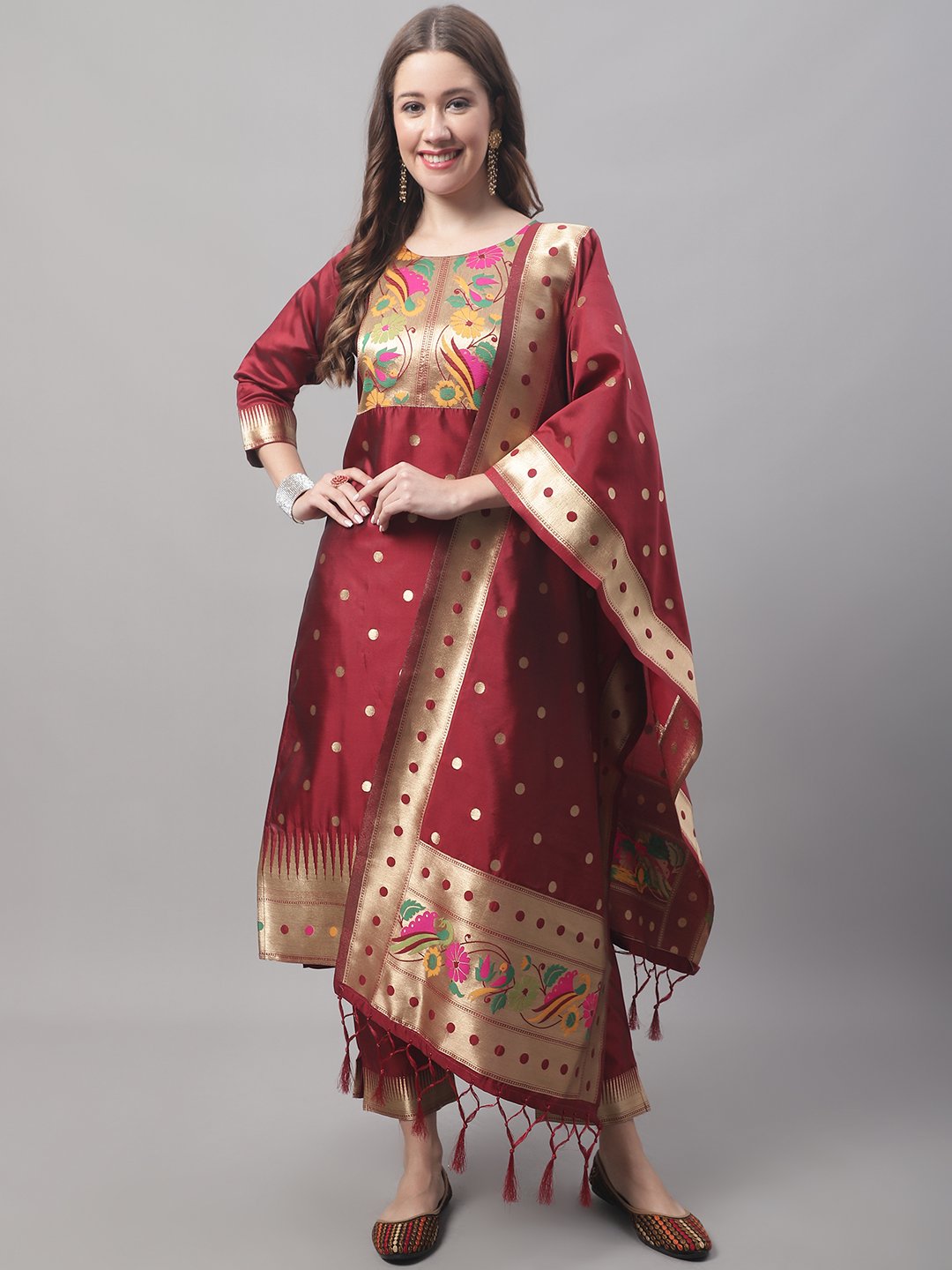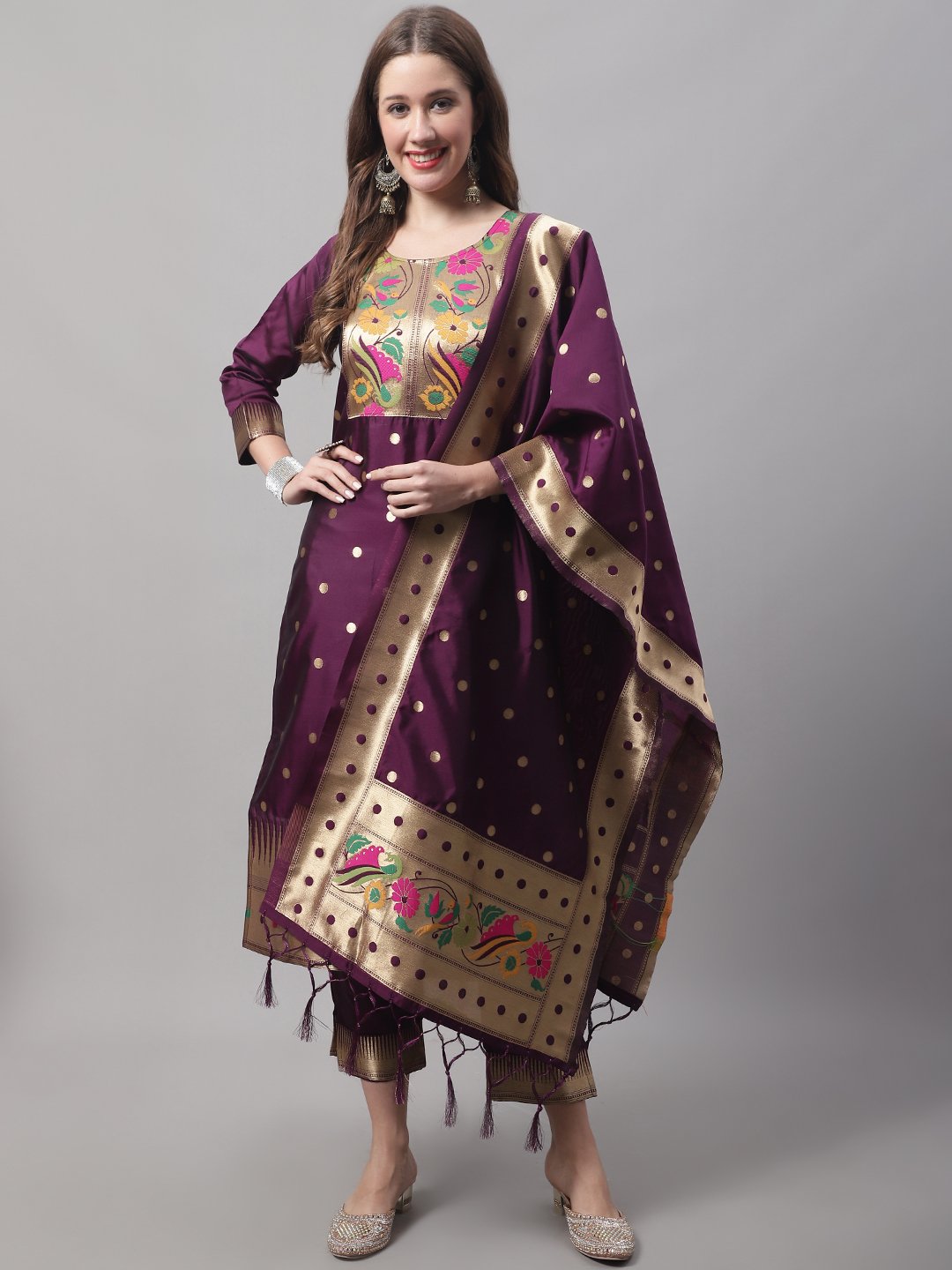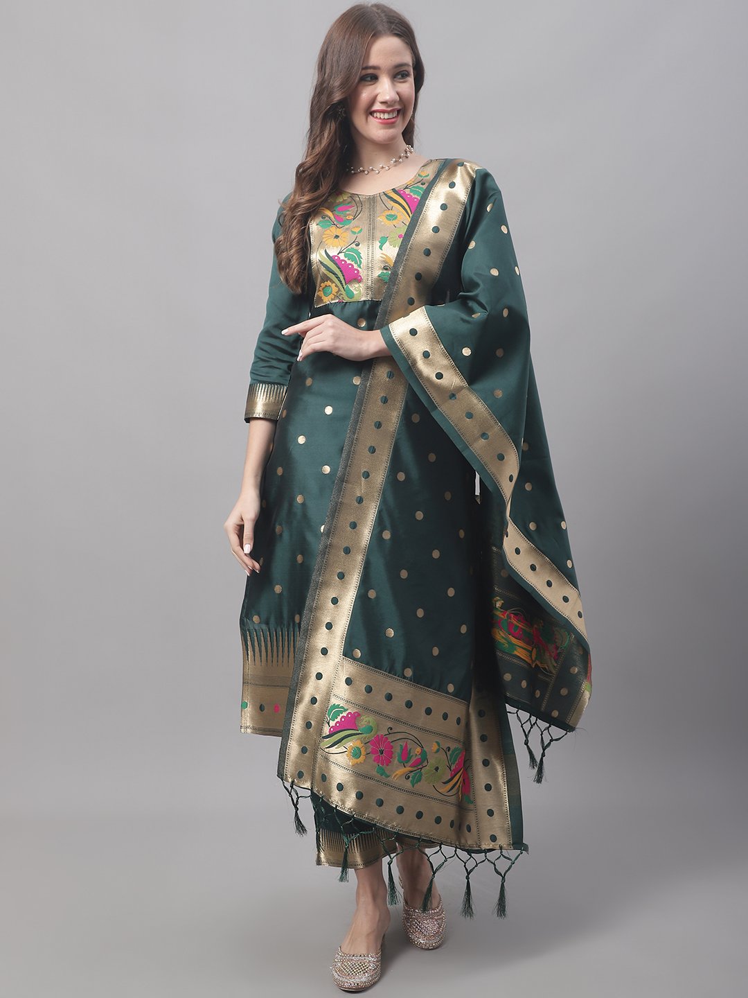 This stunning green Banarasi silk kurta set features rich golden zari weaving and vibrant floral embroidery. The set includes a beautifully detailed kurta, matching pants, and a dupatta adorned with golden polka dots and intricate borders. Perfect for festive occasions, weddings, and celebrations, it combines traditional elegance with modern charm.