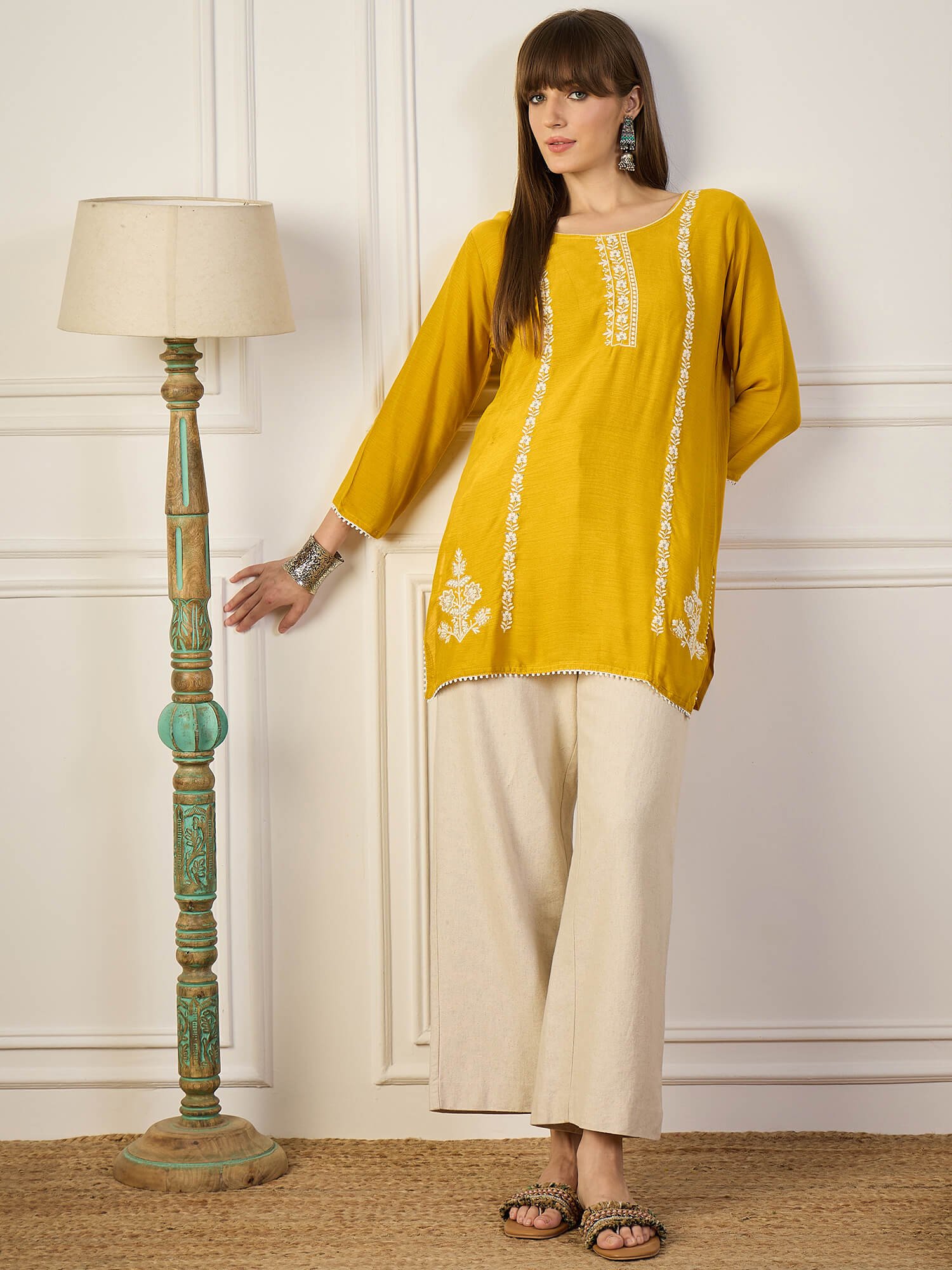 Embrace effortless elegance with this stylish white rayon tunic. Featuring intricate black thread embroidery in a floral/geometric pattern on the yoke and neckline. This breathable, long-sleeved top is perfect for a chic casual or semi-formal look. Pair it with jeans, trousers, or palazzo pants.