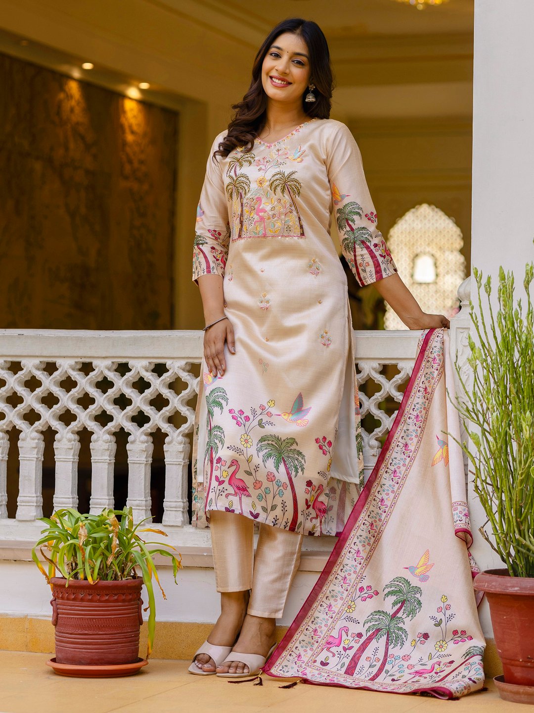 Elevate your ethnic wardrobe with this elegant Viscose Assam Silk Kurta Set, crafted in a soothing ivory base adorned with vibrant nature-inspired prints. Featuring delicate bird, floral, and palm motifs with fine detailing, this kurta set is paired with a matching straight pant and a beautifully bordered dupatta. The soft, breathable fabric offers a luxurious silk-like sheen, making it perfect for festive gatherings, daytime celebrations, and elegant casual wear.