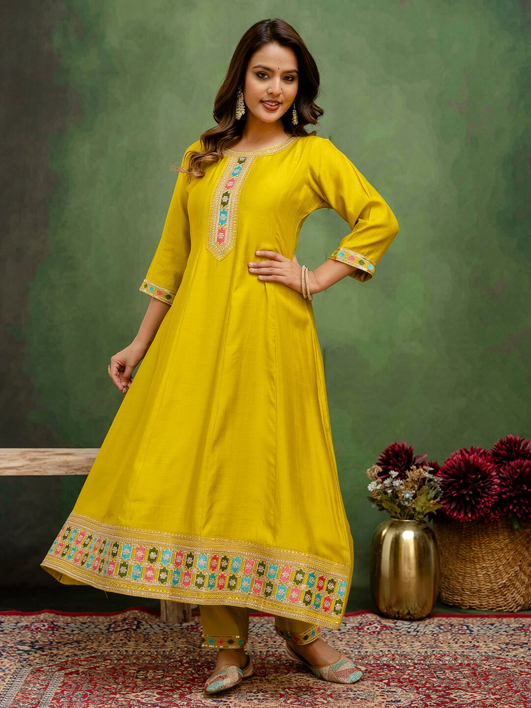 This elegant lemon yellow A-line kurti set comes with intricate multicolor thread embroidery on the neckline, sleeves, hemline, and dupatta border. Crafted from premium fabric, it includes matching straight pants and a beautifully embroidered dupatta—perfect for festive occasions, parties, and ethnic celebrations.