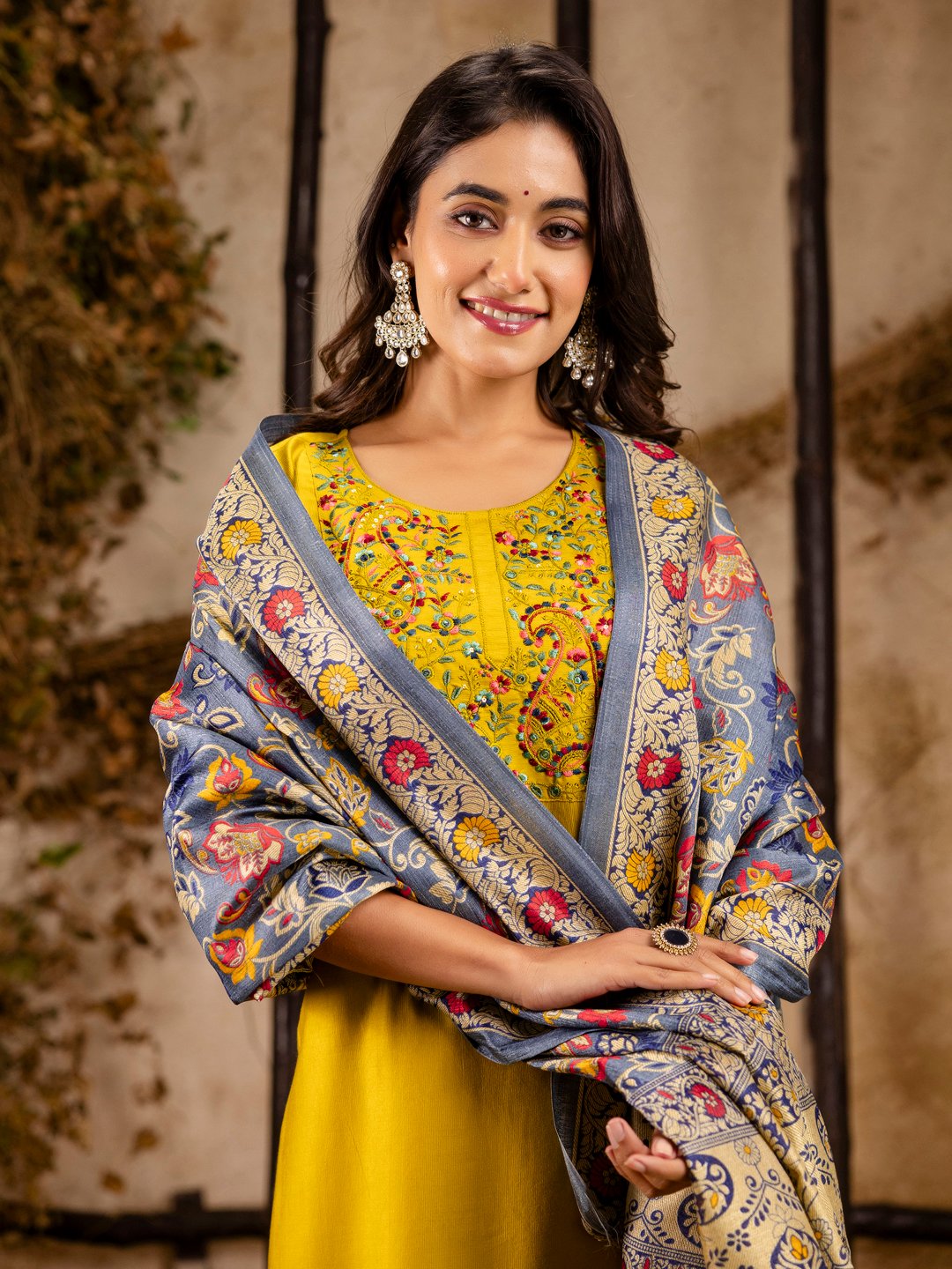 Elegant lemon yellow Viscose Rayon three-piece suit set featuring delicate front embroidery and a beautifully printed dupatta. Soft, breathable fabric perfect for festive wear and casual elegance. Comfortable fitting with stylish ethnic design.