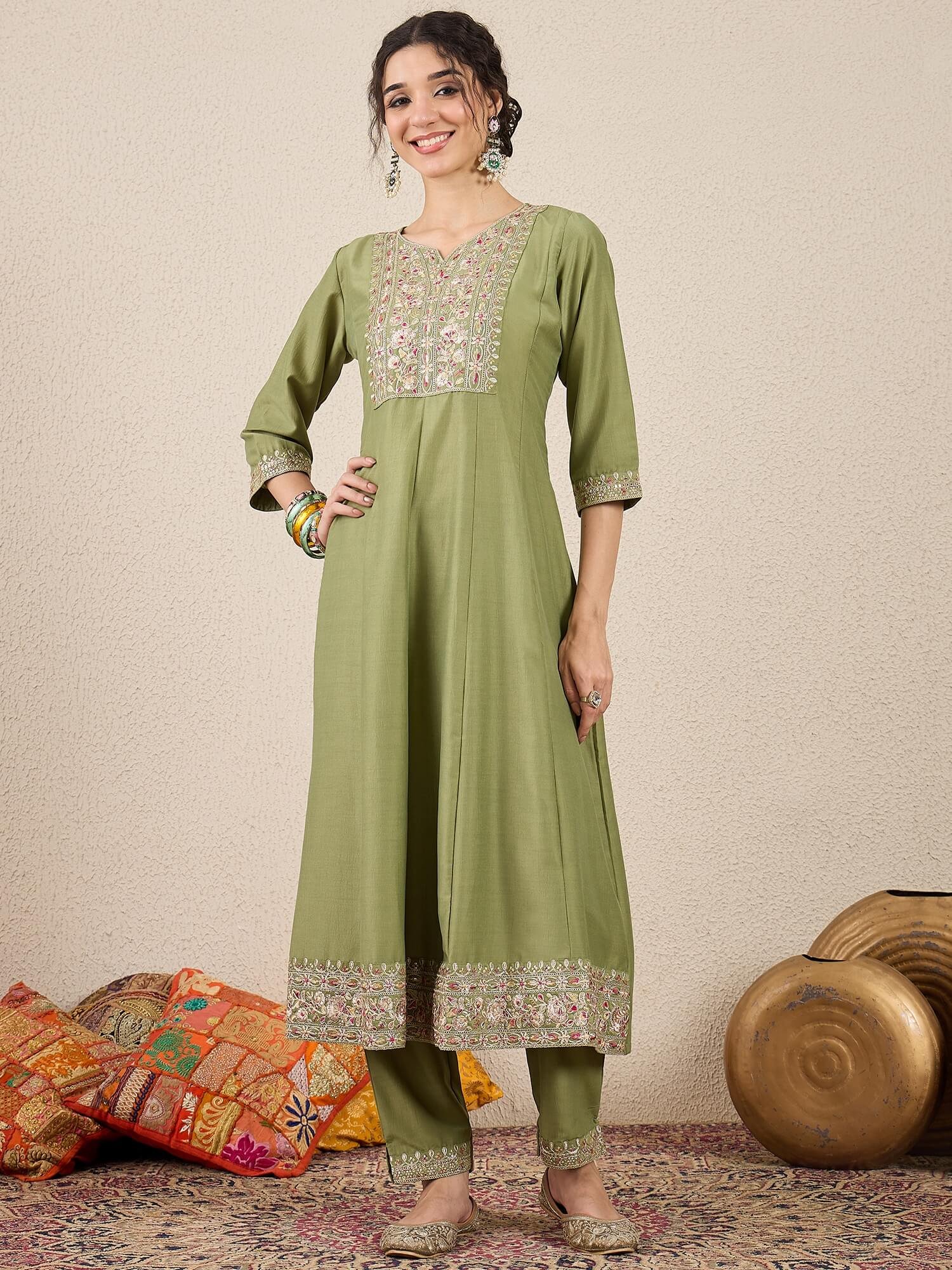 • Fabric: Premium Silk Blend • Work: Intricate Thread Embroidery on Yoke, Sleeve Cuffs & Hemline • Set: Kurta + Pants + Dupatta • Sleeve: Three-Quarter Sleeves • Dupatta: Soft Net/Organza with Lace Border • Style: Festive / Ethnic Wear • Fit: Comfort Fit • Ideal For: Weddings, Festivals, Parties