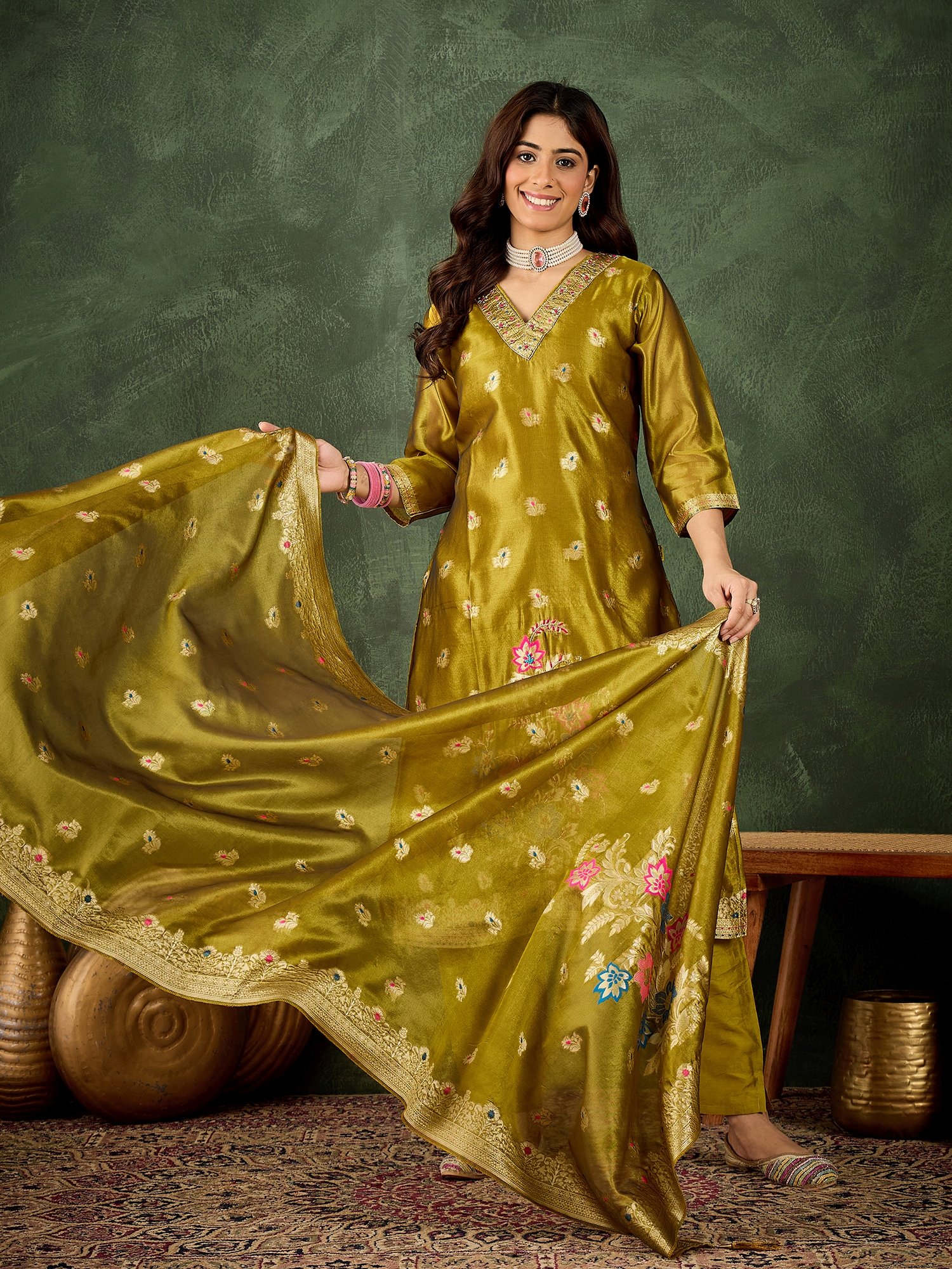 Elevate your ethnic wardrobe with this elegant Silk Organza Meenakari Blend Kurta Set in a rich rosewood pink shade. Crafted with a luxurious silk organza blend, the kurta features delicate all-over Meenakari-inspired floral motifs and a beautifully detailed zari border. Paired with matching straight-fit pants and a coordinated dupatta, this ensemble is perfect for festive occasions, weddings, and cultural celebrations. The soft sheen, lightweight drape, and refined craftsmanship offer both comfort and timeless elegance.