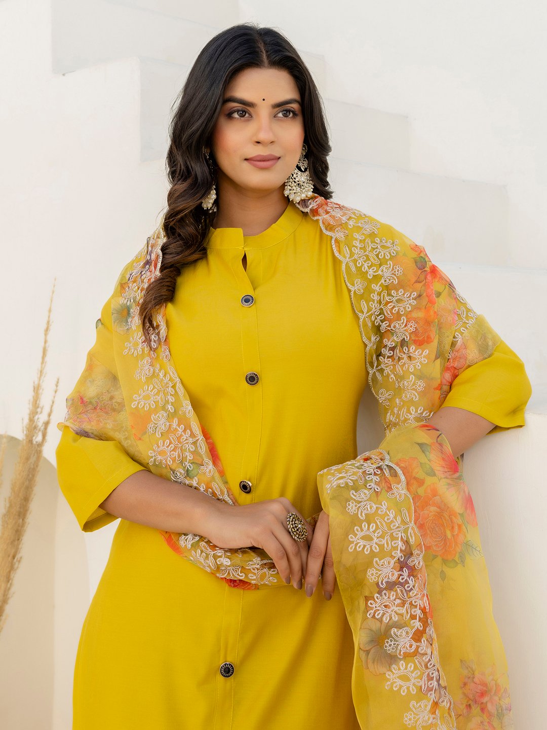 A beautifully crafted rani-pink straight kurta set made from premium shimmer silk fabric, paired with matching pants and an embroidered floral organza dupatta. The outfit features a button-down front, three-quarter sleeves, and a rich festive shine—perfect for celebrations, parties, and ethnic gatherings.
