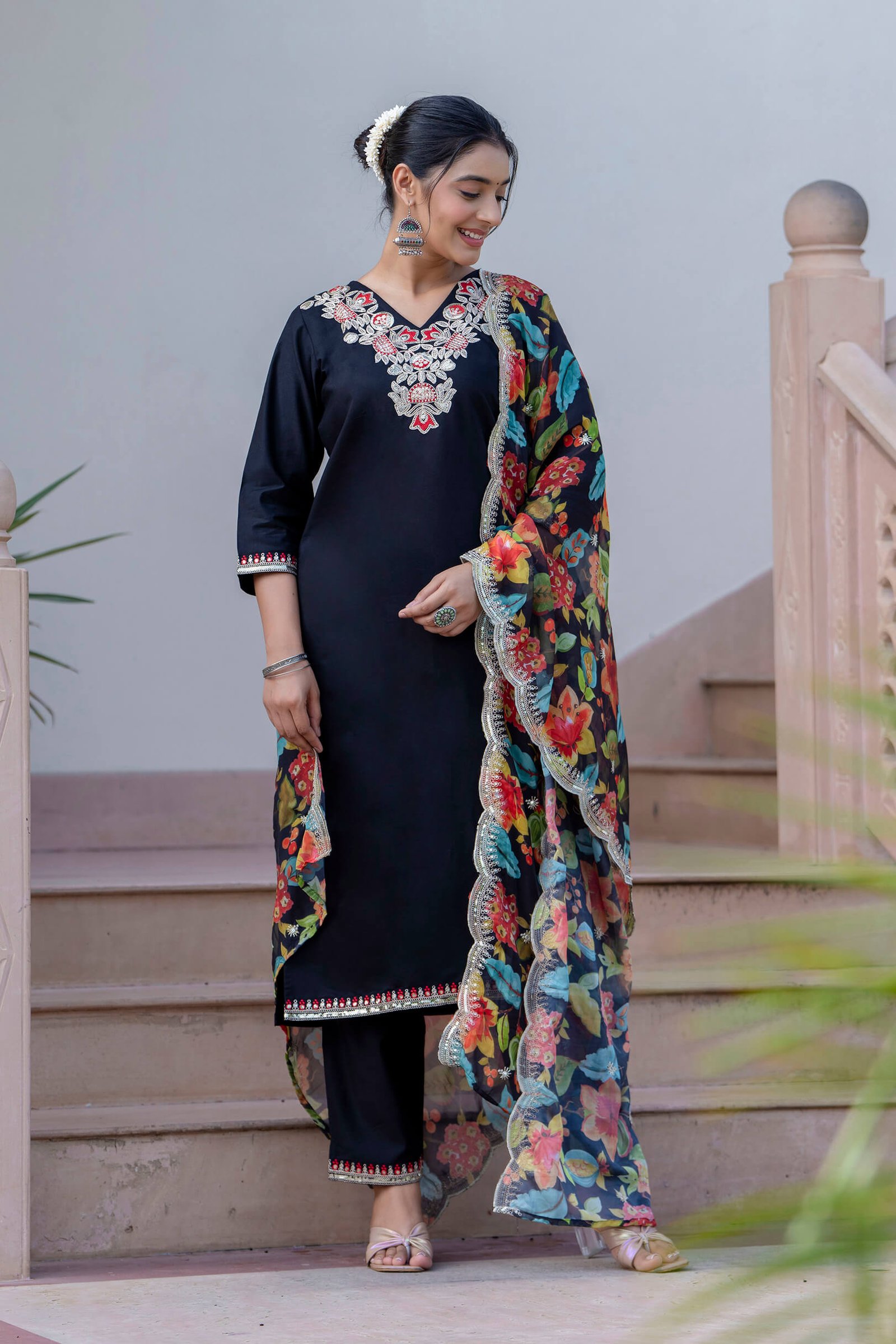 Elevate your ethnic wardrobe with this stunning black cotton suit set. Featuring intricate embroidery on the neckline and sleeves, this ensemble is paired with a vibrant floral organza dupatta that adds a touch of color and charm. Perfect for festive occasions, family gatherings, and traditional celebrations.
