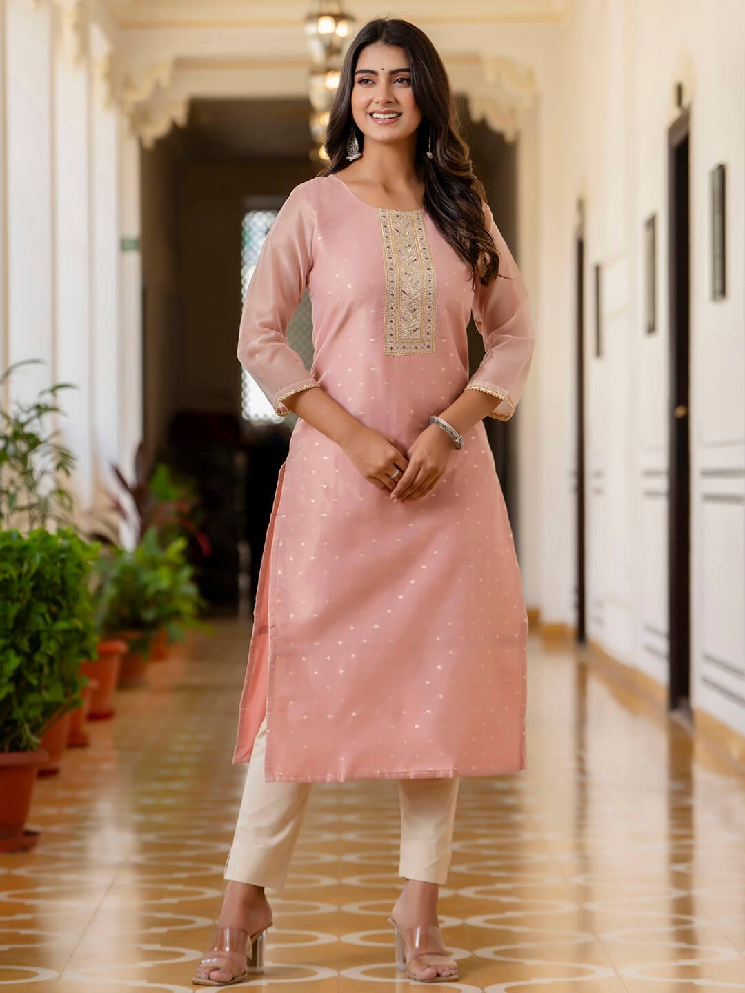 Step into sophistication with this stunning bottle green silk kurta featuring delicate golden thread embroidery on the neckline. Designed with sheer 3/4 sleeves and a straight-cut silhouette, it offers a perfect balance of traditional elegance and modern style. Ideal for festive gatherings, office wear, or evening events. Fabric: Silk blend Color: Bottle Green Neckline: V-neck with embroidery Sleeves: 3/4 sheer sleeves Style: Straight cut with side slits Occasion: Festive, Party, Ethnic, Office wear