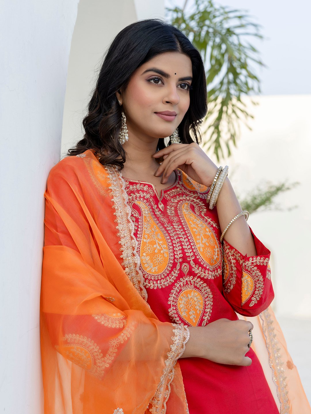 A beautifully crafted rani pink viscose rayon straight suit featuring intricate thread embroidery on the neckline and sleeves. Paired with a contrasting orange organza dupatta with delicate lace border, this outfit offers a perfect blend of elegance and festive charm. Ideal for celebrations, parties, and traditional occasions.