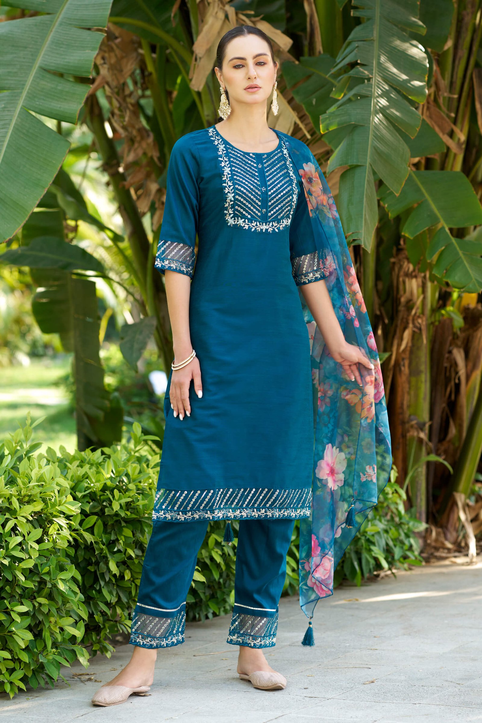 Graceful teal blue kurta pant set featuring elegant white thread embroidery on the yoke, sleeves, hemline, and pant cuffs. The straight-fit kurta is paired with matching pants and a lightweight https://pptoss.com/adminw1010/admin/master#tab_2floral printed organza dupatta finished with tassels. Ideal for festive occasions, office wear, and elegant day gatherings.