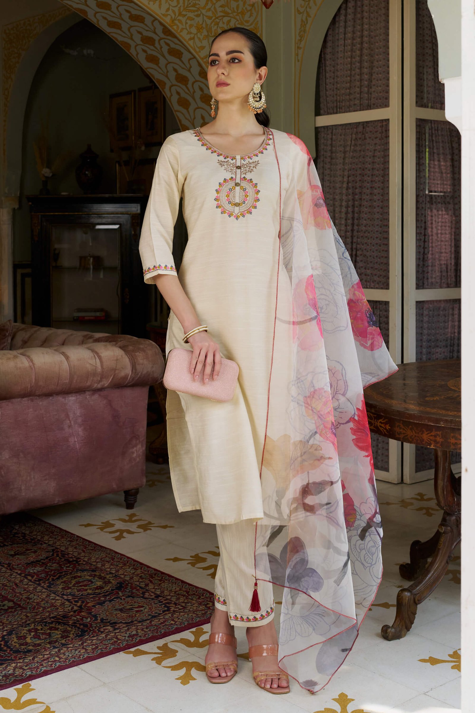 Grace meets simplicity with this beautiful off-white kurta set. The kurta features delicate multicolor floral embroidery on the neckline, paired with matching straight pants. The look is completed with a soft organza dupatta adorned with large floral prints and tassel detailing. Perfect for festive wear, small functions, office events, and daytime celebrations. ? Color: Off White ? Fabric: Premium Blend (Kurta & Pant) ? Dupatta: Soft Organza with Floral Print ? Work: Embroidered Neckline ? Pant: Straight Fit ? Occasion: Festive | Casual | Office | Family Functions ? Comfortable & Elegant Fit