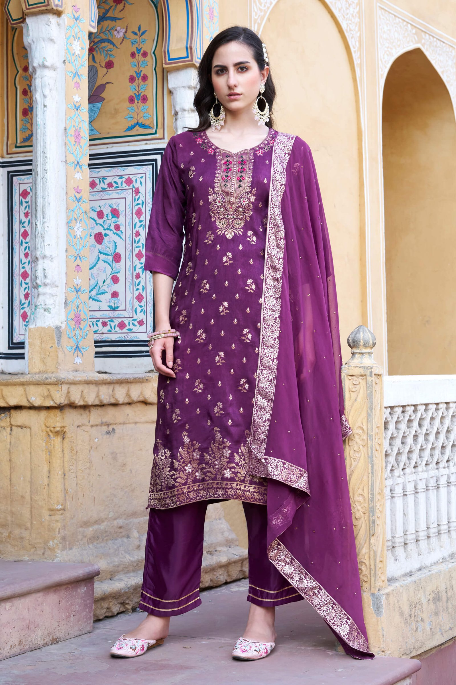 Elegant purple kurta pant set, featuring rich all-over golden embroidery with a beautifully detailed neckline. Paired with matching straight pants and a coordinated embroidered dupatta, this ethnic set is perfect for festive occasions, weddings, and traditional gatherings. Crafted for comfort and royal appeal.