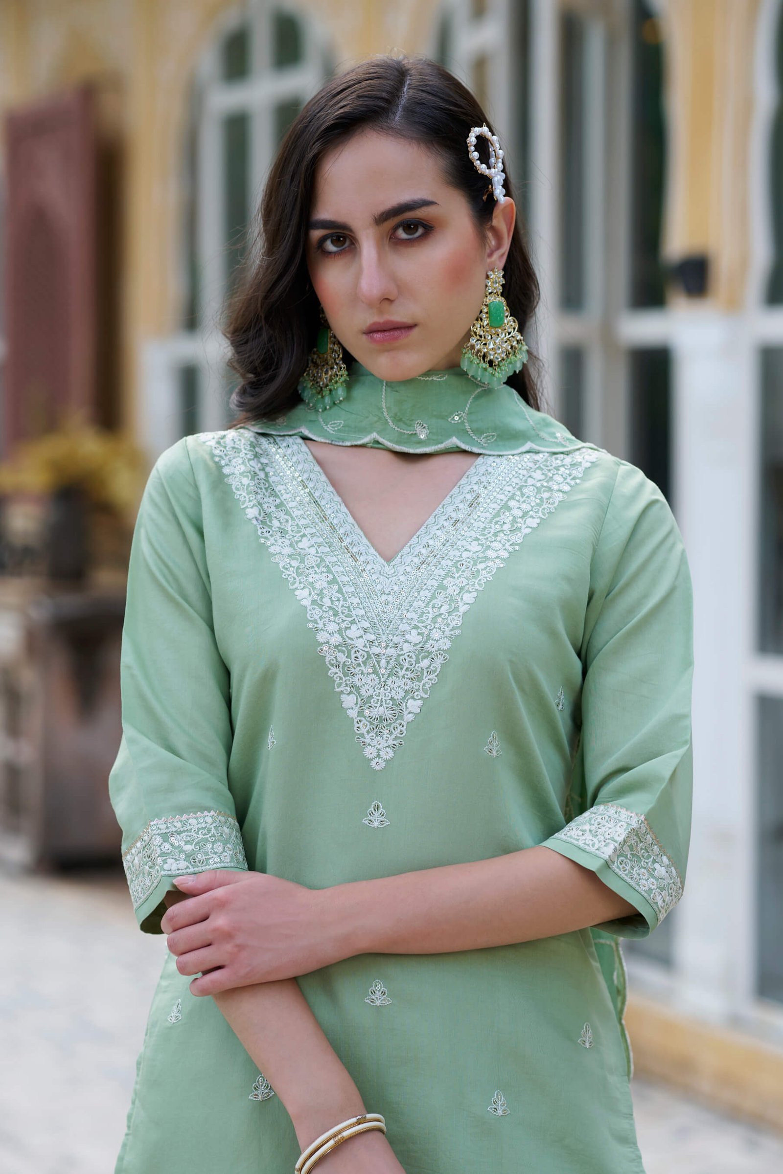 Graceful pista green kurta set featuring a beautifully embroidered V-neckline and delicate all-over motifs. Comes with matching straight pants and a lightweight embroidered organza dupatta with scalloped borders. Ideal for festive occasions, daytime celebrations, and elegant ethnic wear.