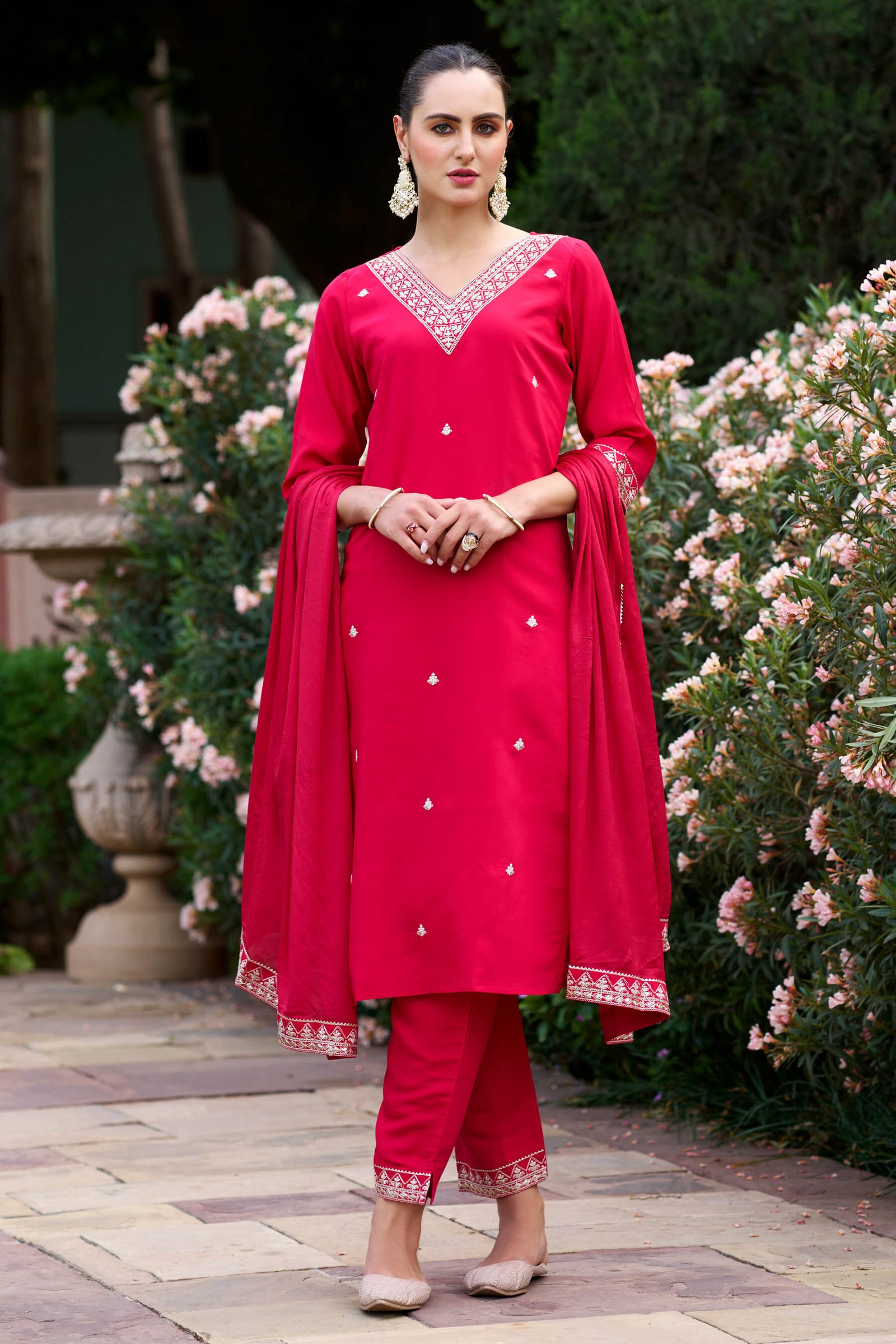 Graceful rani pink kurta pant dupatta set featuring fine embroidery on the neckline, sleeves, and hem. Crafted in a soft, breathable fabric with delicate butti work all over, this ethnic set is perfect for festive occasions, weddings, and traditional gatherings. Comes with a matching embroidered dupatta and straight-fit pants for a complete elegant look.