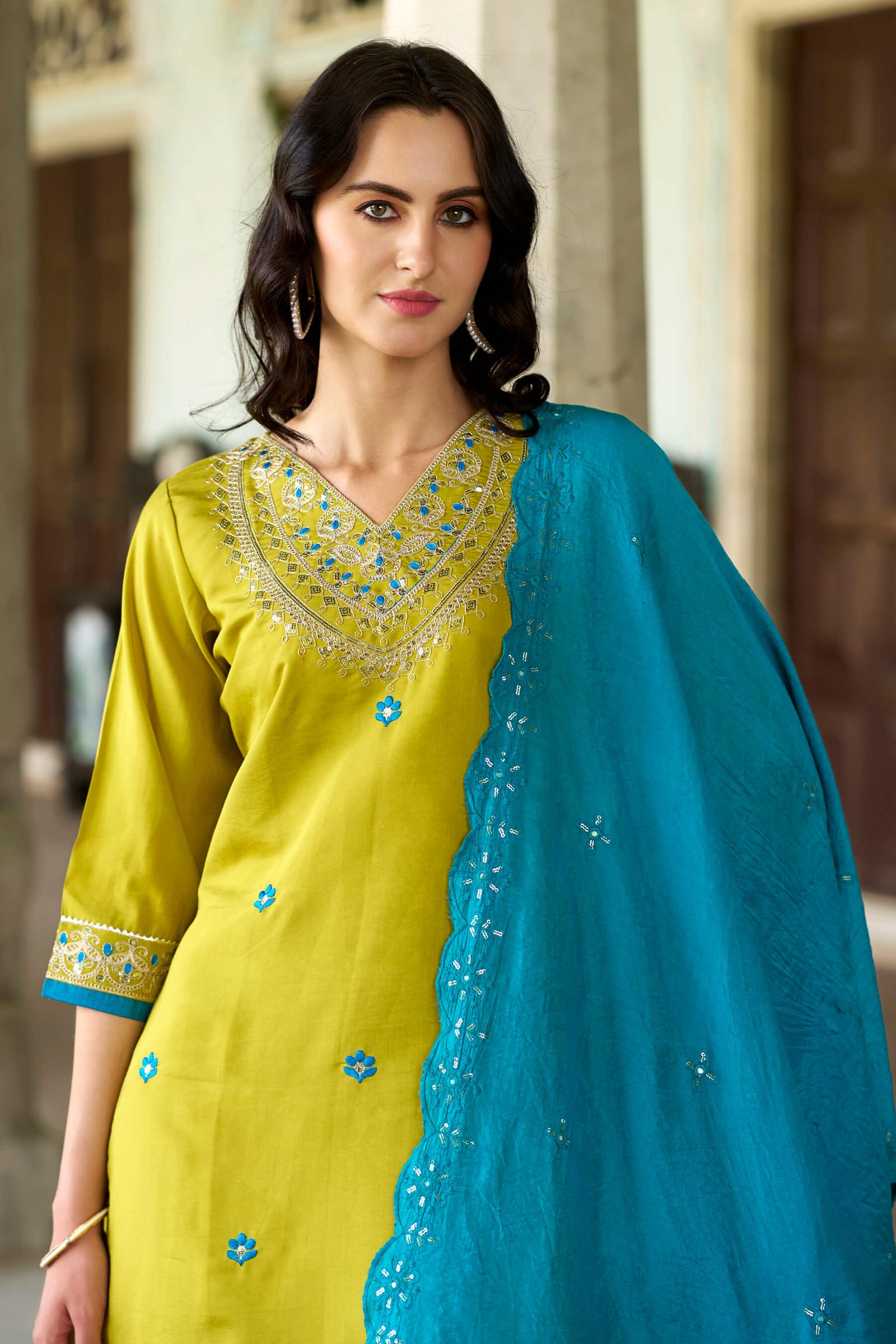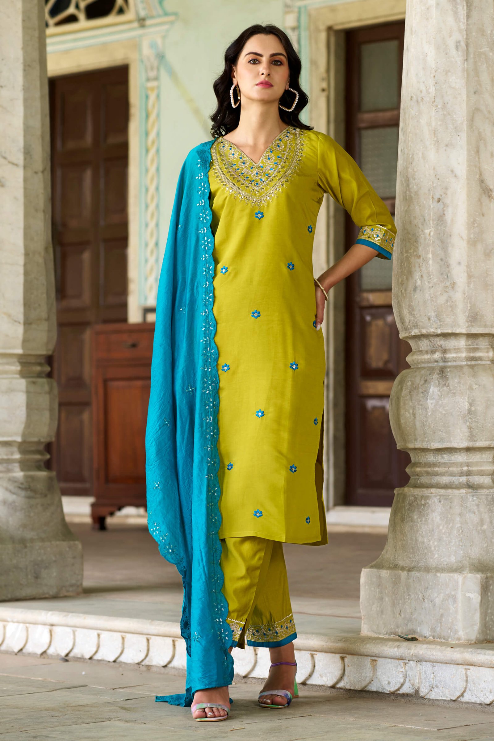Graceful lemon yellow straight kurta set enhanced with delicate blue embroidery on the neckline and subtle motifs all over. Paired with matching straight pants and a contrasting teal blue embroidered dupatta, this elegant ethnic set is perfect for festive wear, daytime functions, and special occasions.