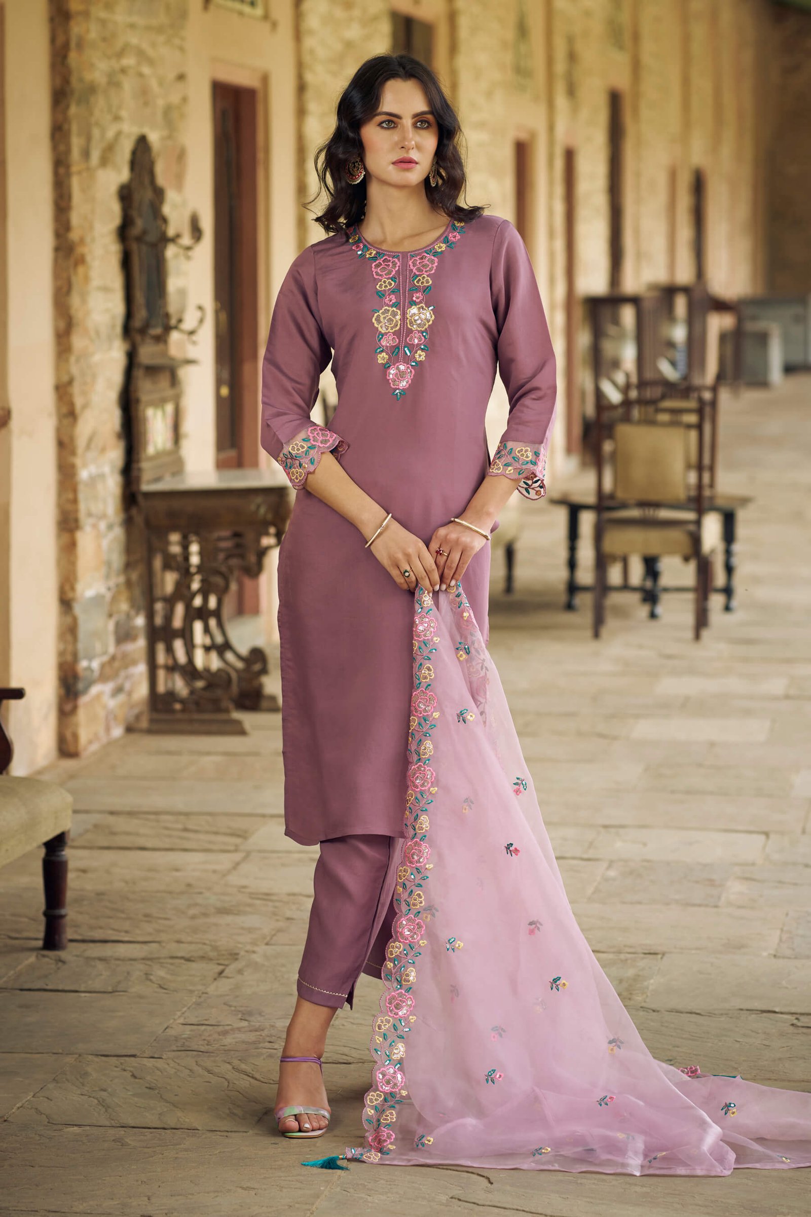 Elegant mauve purple kurta pant set featuring delicate floral embroidery on the neckline, sleeves, and dupatta border. The straight-cut kurta is paired with matching pants and a soft, sheer net dupatta adorned with subtle embroidered motifs. Perfect for festive occasions, parties, and elegant day functions.