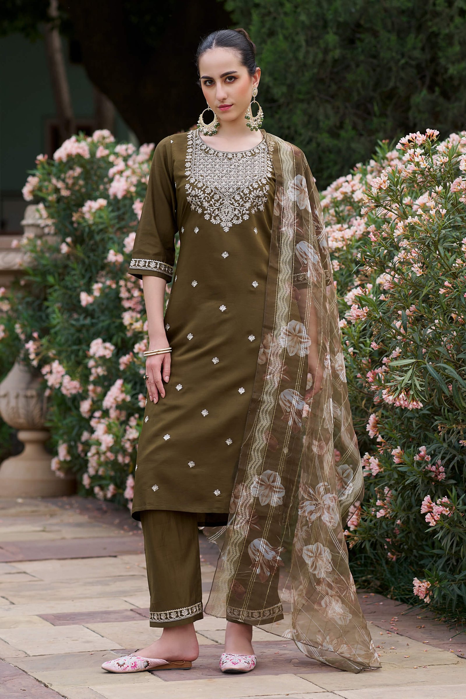 Elegant mehndi green kurta pant set featuring intricate white thread embroidery on the neckline and sleeves. The straight kurta is paired with matching pants and a beautifully printed sheer organza dupatta with floral motifs, making it perfect for festive wear, functions, and special occasions.