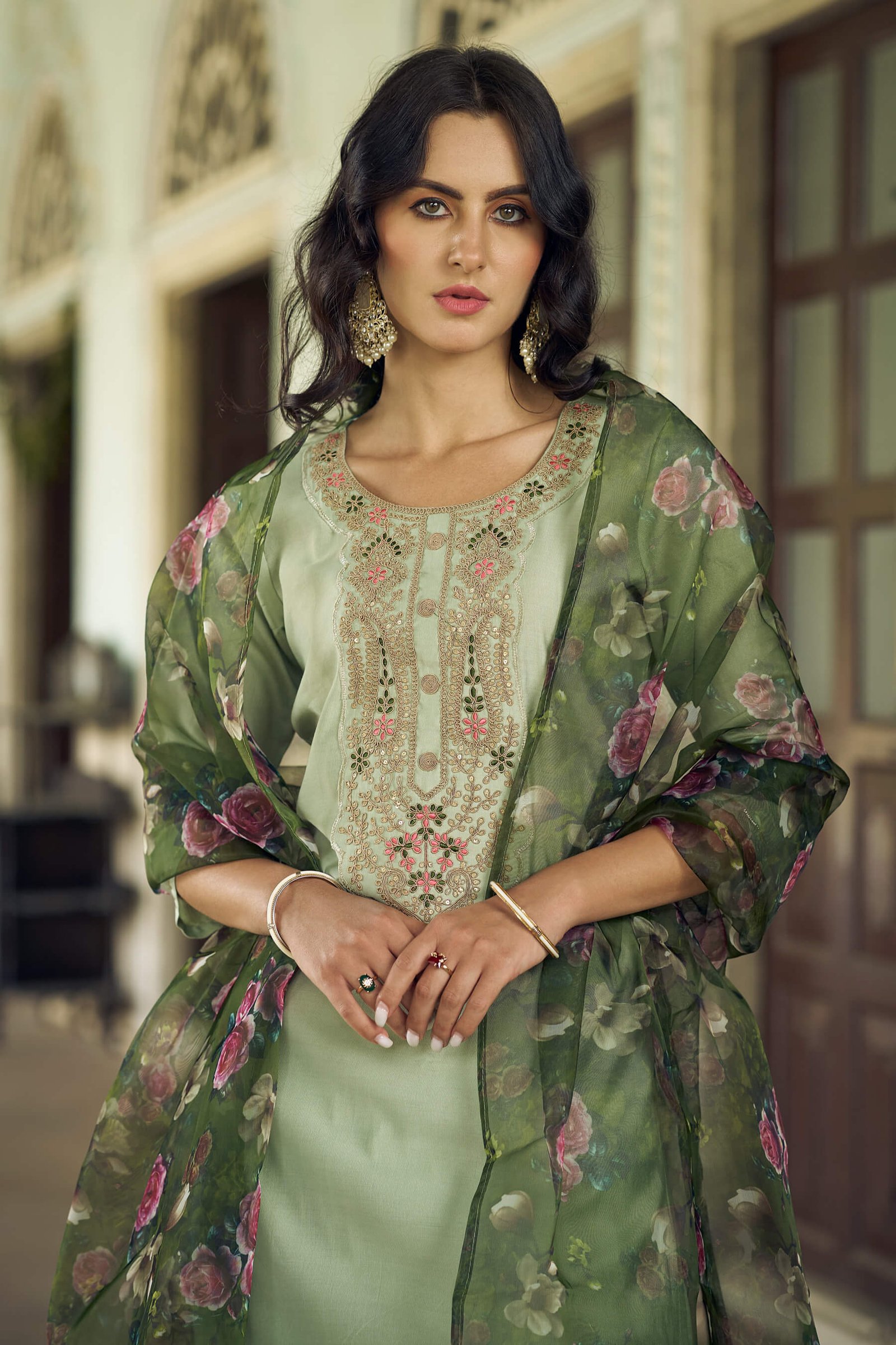 Grace your ethnic collection with this elegant pista green kurta set, featuring delicate embroidery on the neckline and fine lace detailing at the hem. The set is paired with matching straight pants and a lightweight floral organza dupatta in soft green tones, adding a refreshing and feminine charm. Ideal for festive occasions, daytime celebrations, and elegant gatherings.
