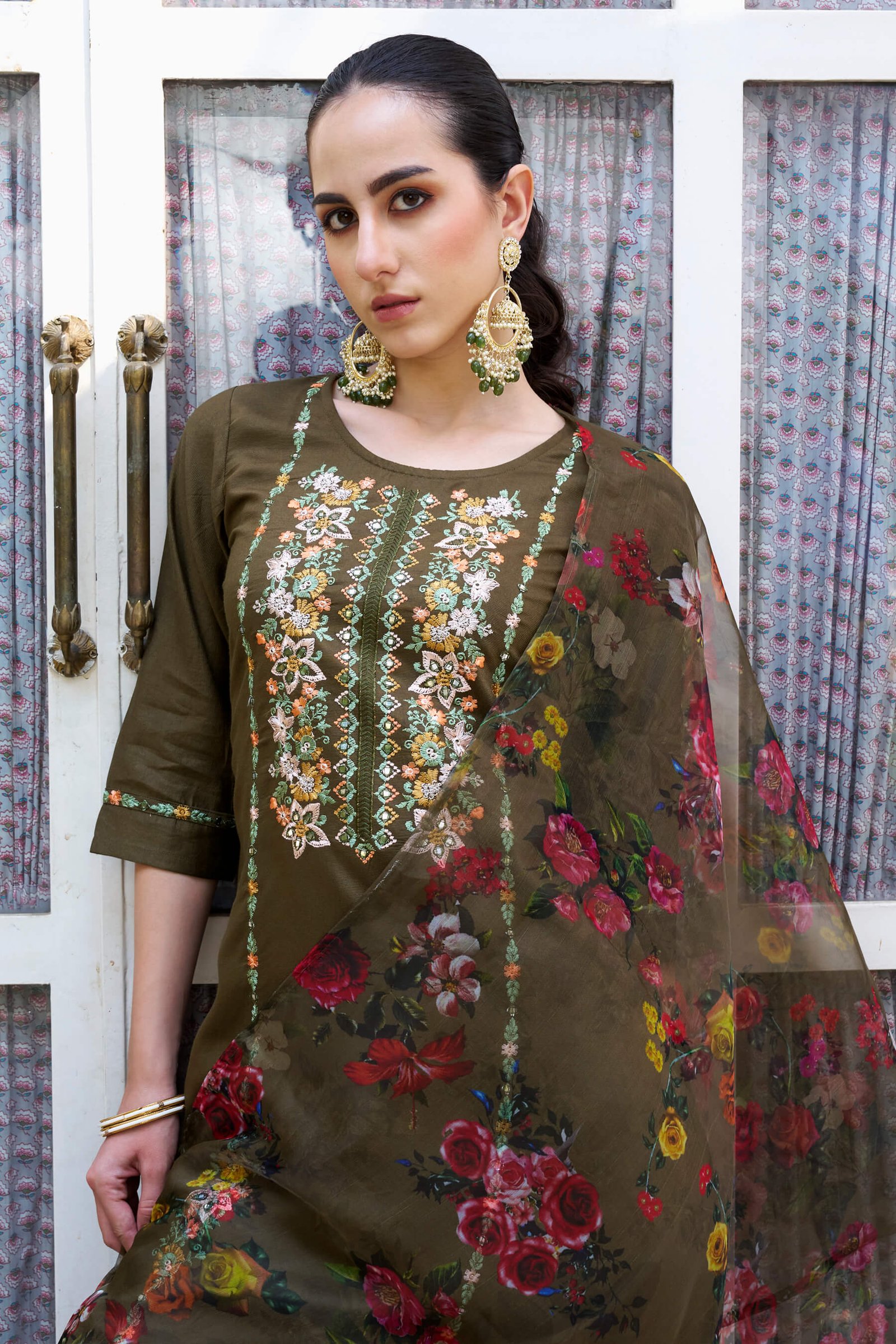 Elegant mehndi green straight kurta set featuring delicate multicolor floral embroidery on the yoke and borders. Paired with matching straight pants and a lightweight floral printed organza dupatta. Perfect for festive wear, daytime functions, and ethnic gatherings.