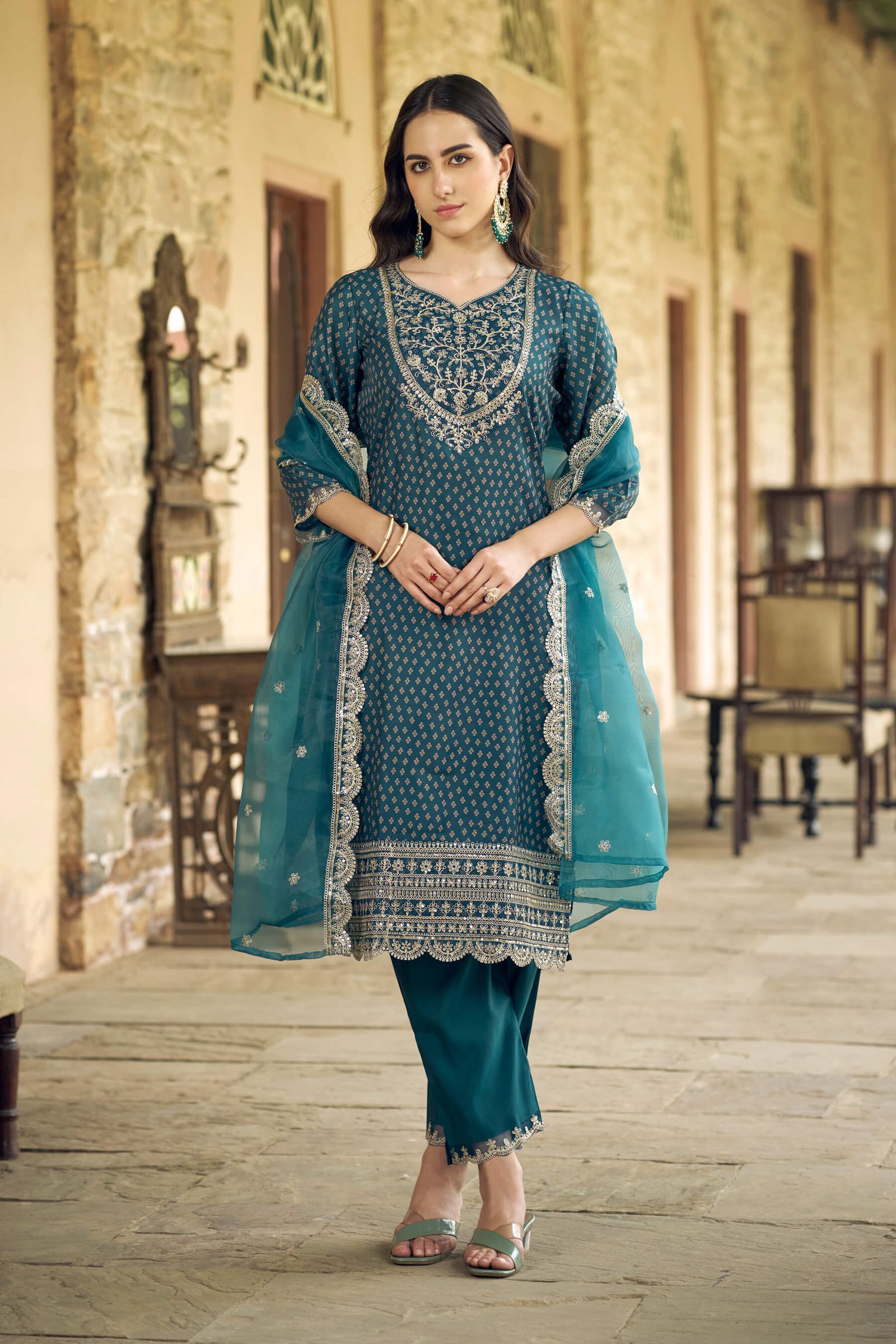 Graceful maroon kurta set with delicate embroidery on the neckline and sleeve borders. Comes with matching pants and a soft dupatta, making it an ideal choice for festive wear, celebrations, and traditional events.