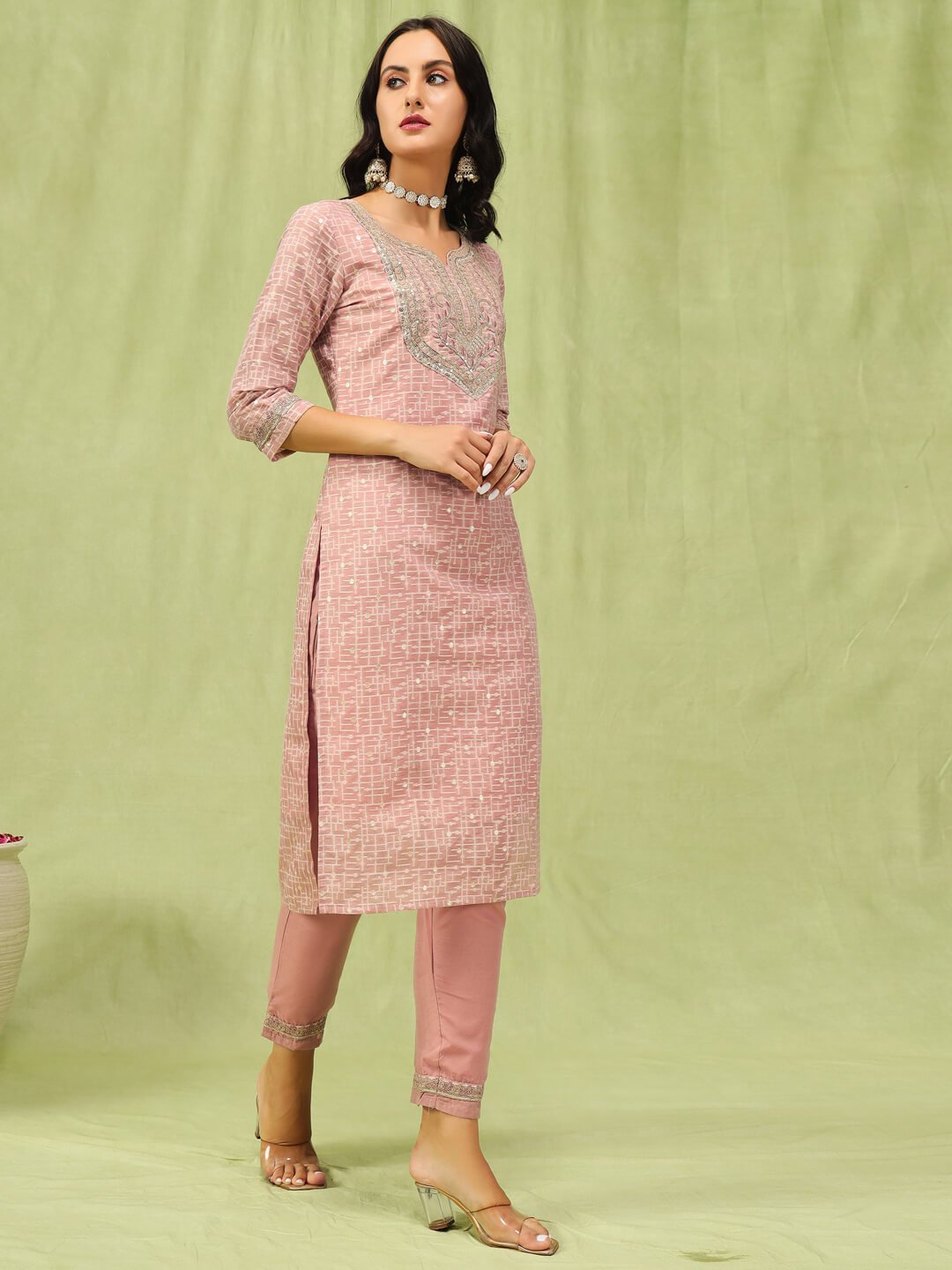 Grace your ethnic wardrobe with this elegant peach kurta set, featuring delicate embroidery on the neckline and an all-over subtle geometric print. Crafted from soft, breathable fabric, the kurta is paired with matching straight pants and a lightweight peach dupatta. Ideal for festive occasions, office wear, and casual celebrations, this outfit offers a perfect blend of comfort and sophistication.