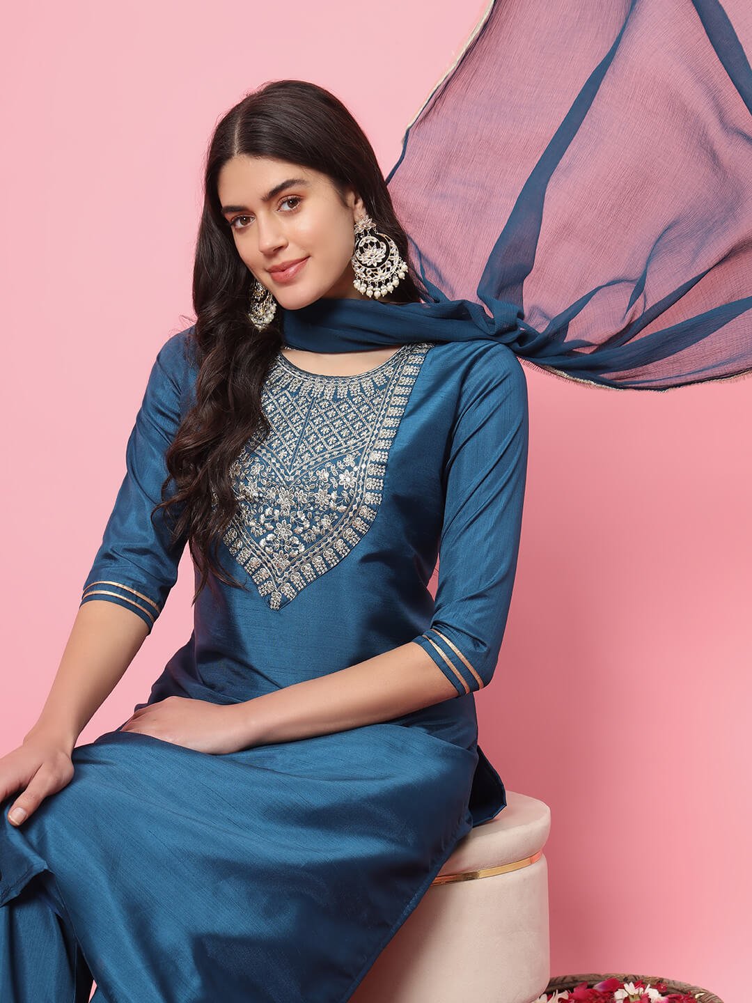 A premium teal blue silk straight-fit suit featuring intricate silver thread embroidery on the neckline, paired with matching pants and a soft chiffon dupatta. Perfect for festive events, weddings, and elegant celebrations.