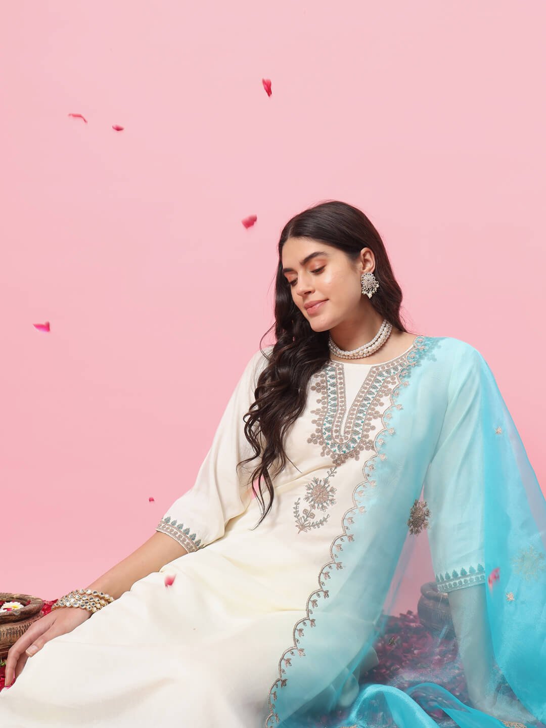 Elegant white straight kurti featuring intricate silver embroidery on the neckline and front panel Paired with matching white pants for a clean, graceful silhouette Comes with a beautiful sky-blue organza dupatta embellished with floral motifs and scalloped border Perfect for festive functions, daytime events, and elegant celebrations Comfortable fabric with a classy, minimal yet premium look