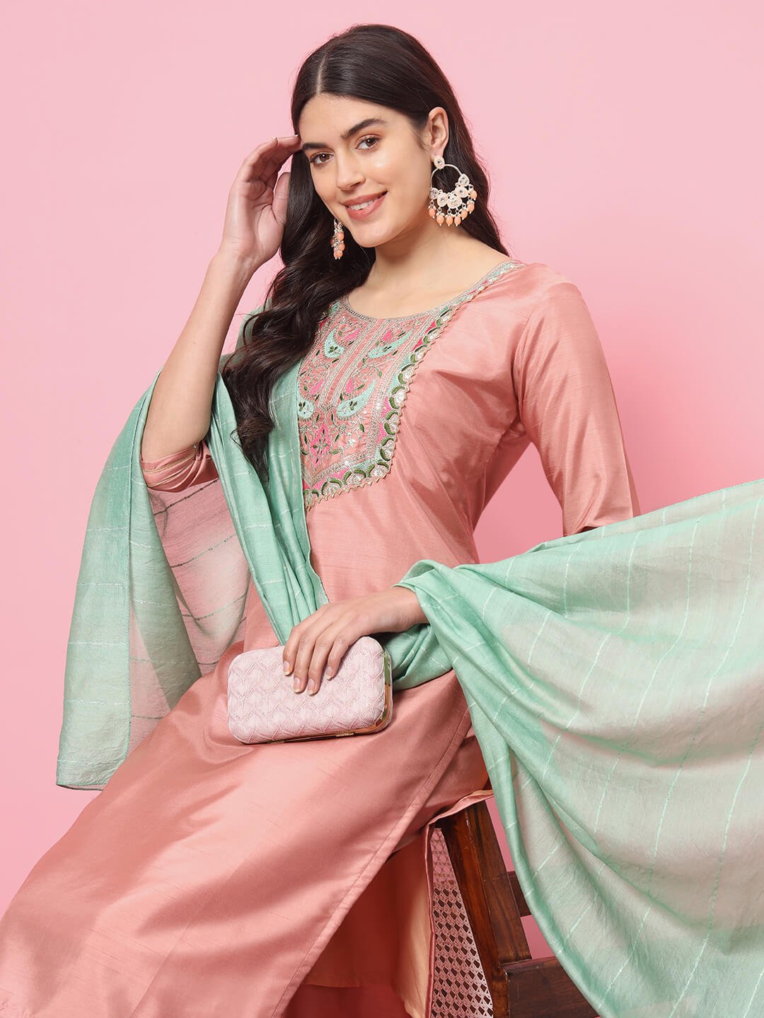 Graceful peach-colored kurta pant set featuring intricate floral embroidery on the neckline. Comes with matching straight pants and a contrasting mint green dupatta, making it an ideal choice for festive gatherings, celebrations, and elegant day wear.