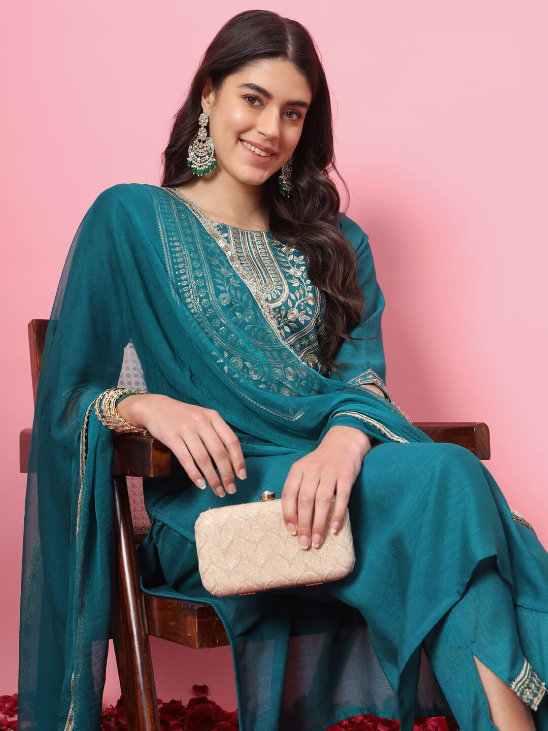 Elegant Rama Green kurta set featuring beautiful traditional embroidery on the neckline. Comes with a matching straight pant and a soft, lightweight dupatta with fine border detailing. Perfect for festive wear, family functions, office ethnic days, and casual celebrations.