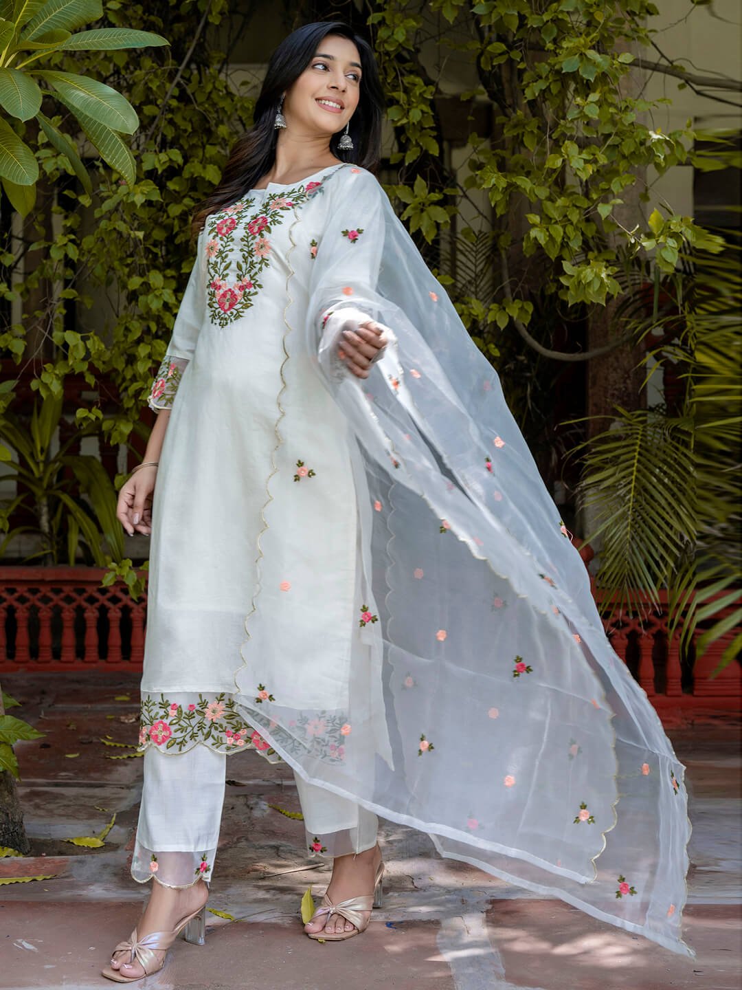 Grace your ethnic collection with this elegant white cotton kurta set, beautifully adorned with floral embroidery in pink and green hues. The set includes a straight-cut kurta, matching pants, and a soft organza dupatta with delicate embroidered details. Perfect for festive occasions, family gatherings, and casual outings, this outfit blends comfort with timeless elegance.