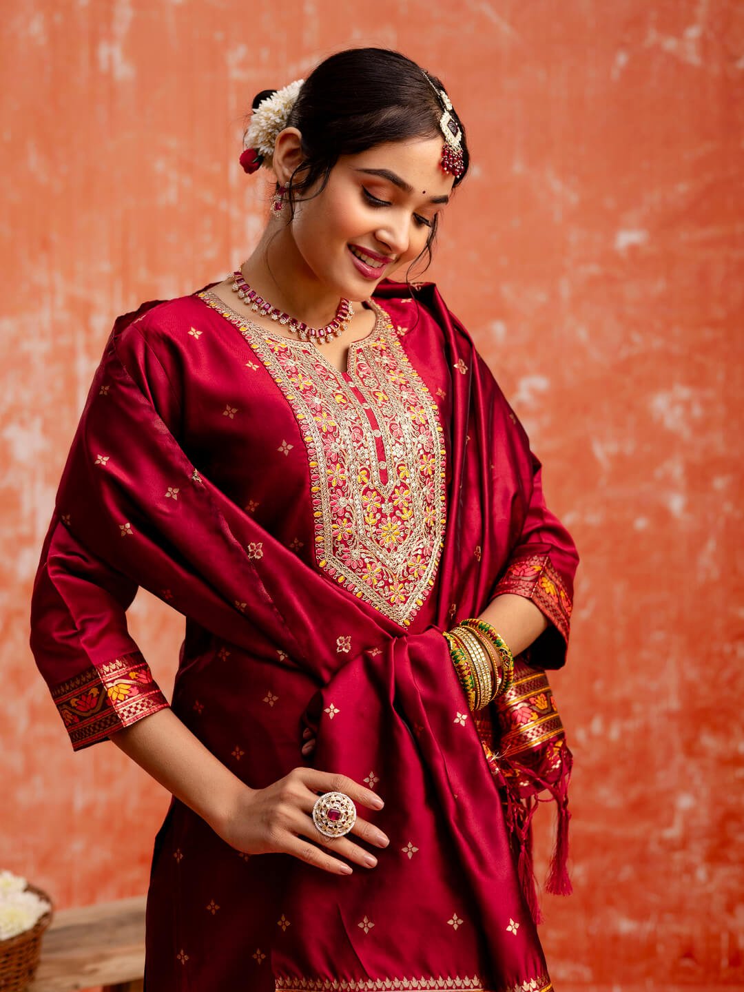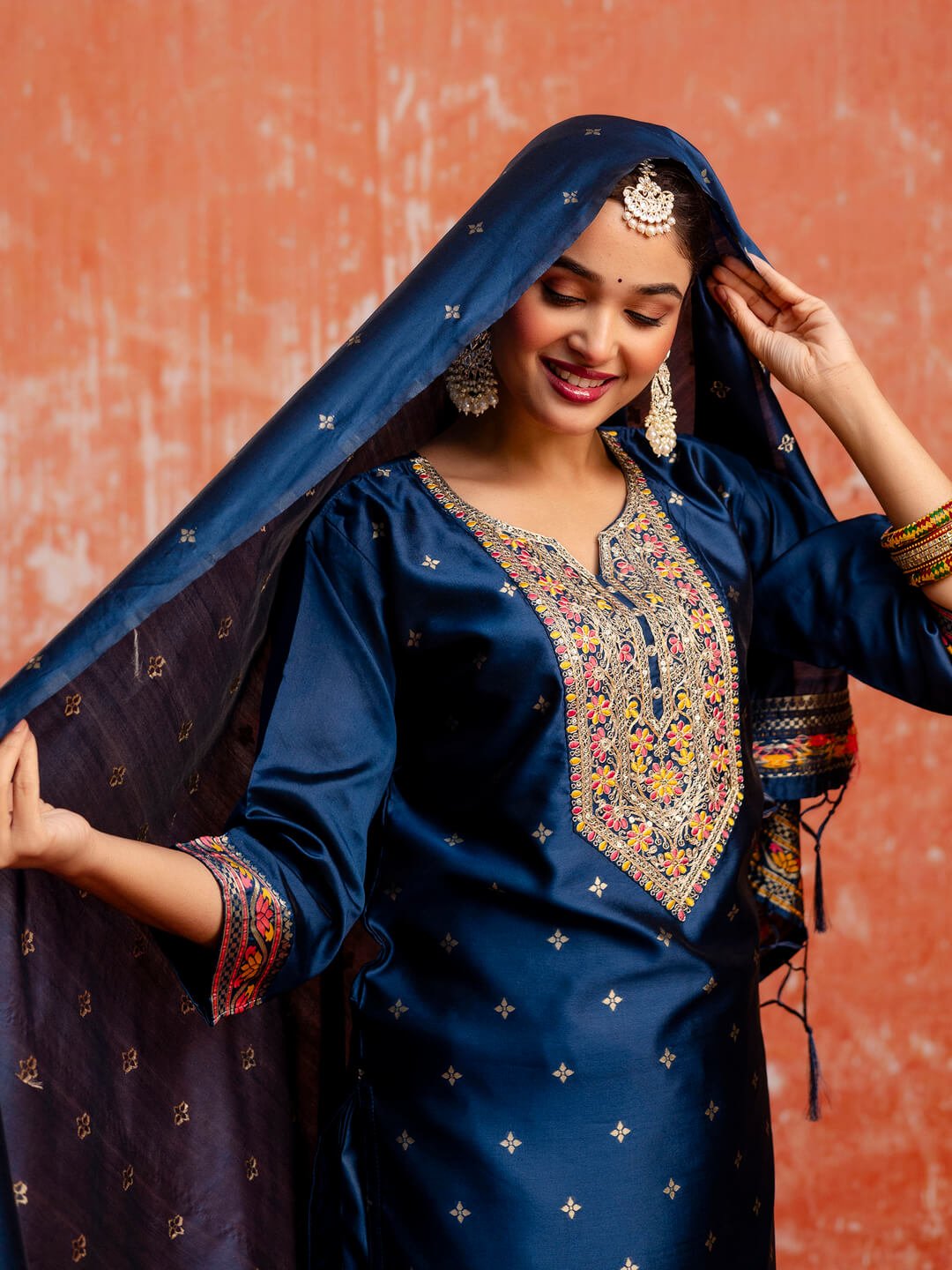 A luxurious teal-blue ethnic kurta set crafted with rich woven detailing, intricate embroidered neckline, and vibrant border work. Paired with matching pants and a beautifully coordinated dupatta. Perfect for festive events, weddings, and traditional celebrations.