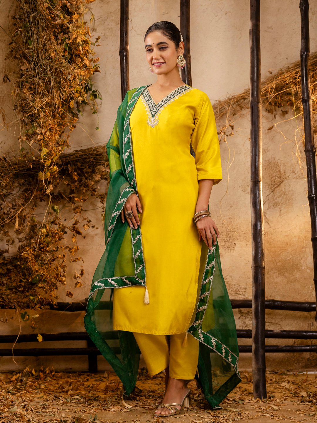 Elevate your festive and ethnic wardrobe with this elegant silk blend kurta set, featuring a vibrant yellow kurta paired with matching pants and a contrasting green embroidered dupatta. Perfect for parties, functions, and traditional occasions. Soft fabric with comfortable fit and classy design.