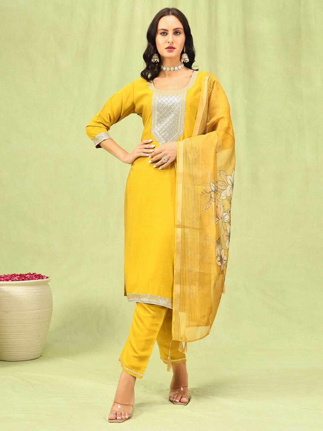 Graceful yellow kurti pant set featuring elegant embroidery on the neckline and sleeve borders, paired with a soft printed dupatta. Perfect blend of comfort and festive elegance, ideal for daily wear, office wear, and small celebrations.