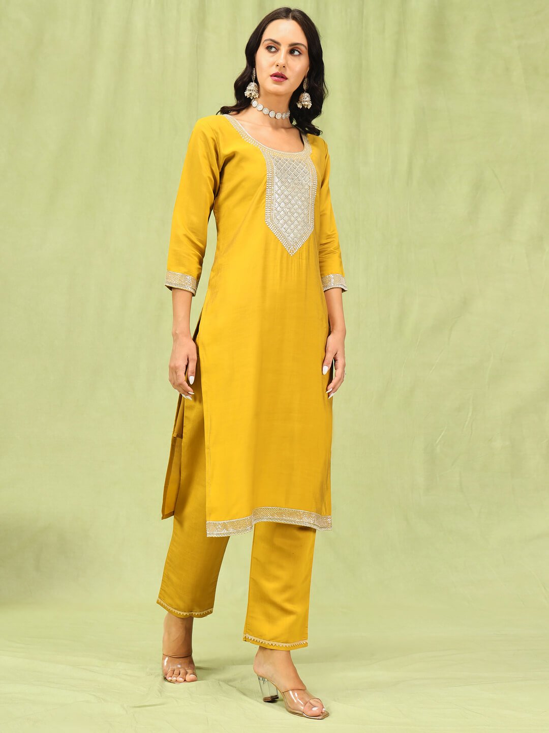 ? Design No.: VV-9585 Yellow ? Kurti Fabric: Premium Silk Blend ? Pant Fabric: Matching Silk Blend ? Dupatta Fabric: Soft Organza with Printed Border & Tassel Detailing ? Sizes Available: S, M, L, XL, XXL ? Sleeves: Three-Quarter Sleeves ? Color: Bright Mustard Yellow ? Work: Elegant Neck Embroidery with Minimal Border Detailing ? Availability: Ready Stock ? Dispatch: All India & International Shipping Available Perfect for festive wear, family functions, small gatherings & ethnic occasions.
