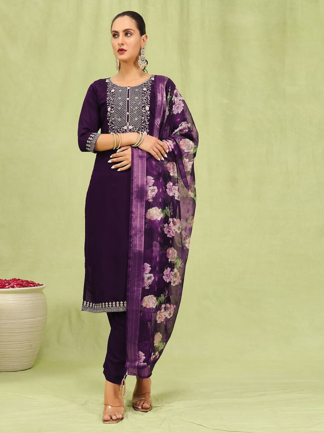 Upgrade your ethnic collection with this stunning purple kurti pant set designed for modern women who love elegance and comfort. ? Color: Rich Purple ? Fabric (Kurti & Pant): Premium Silk Blend / Soft Fabric ? Dupatta: Floral Printed Organza Dupatta with Border ? Work: Heavy Embroidery on Neckline & Sleeves ? Sleeves: 3/4th Sleeves ? Fit: Straight Fit ? Occasion: Festive Wear, Party Wear, Wedding Functions, Traditional Events ? Sizes Available: S to XXL ? Style: 3 Piece Ethnic Set (Kurti + Pant + Dupatta) This outfit gives a royal and classy look, perfect for festive gatherings and special occasions.